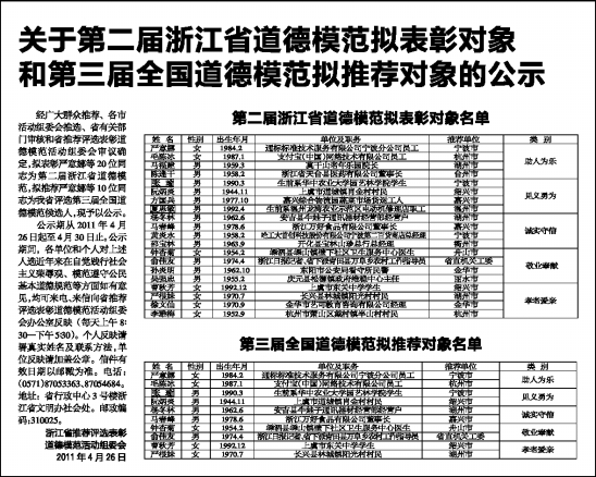 关于第二届浙江省道德模范拟表彰对象 和第三届全国道德模范拟推荐对象的公示
