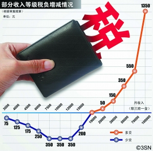 有数据显示,将个税工薪费用的减除标准上调至每月3000元后,与2010年相比,约减少个人所得税收入990亿元。以每月收入4500元(扣除社保、公积金等)为例,根据现行税率要缴个税250元,而根据草案规定的税率,最多只用缴75元,减幅达70%。