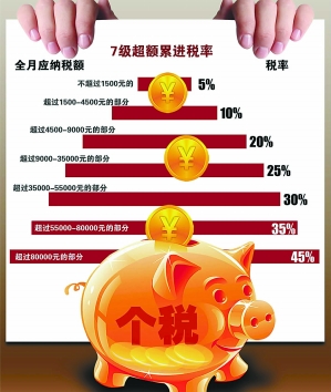 草案还将现行工薪所得9级超额累进税率修改为7级,取消15%和40%两档税率,扩大低档税率的适用范围,加大对高收入者的调节力度。并且,草案将现行适用40%税率的应纳税所得额并入到45%税率,超过8万元的部分都适用45%的税率。
