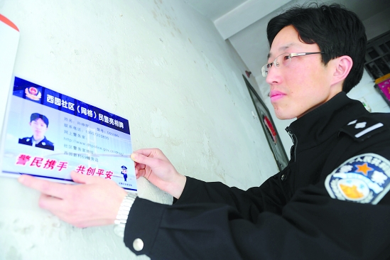 定海解放路派出所的民警正在安装“网格民警亮相牌”。 江勇 孙铮辉 摄
