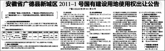 经安徽省广德县人民政府批准,广德县国土资源局决定公开出让广德县新城区2011-1号国有建设用地使用权。现将有关事项公告如下: