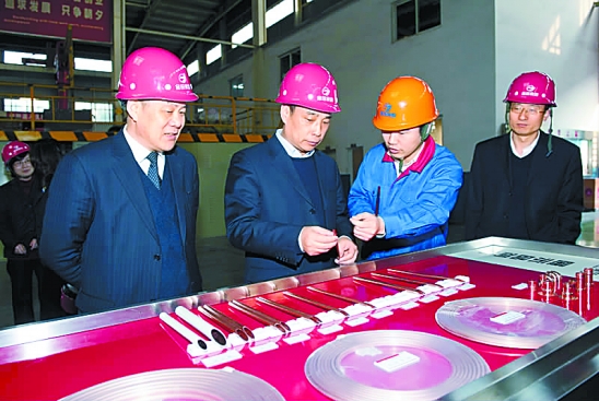 近日,工行宁波分行领导带队走访企业,调研企业生产经营情况和金融服务需求。图为该行领导在宁波金田投资控股(集团)有限公司铜管生产车间了解生产情况。沈颖俊 摄
