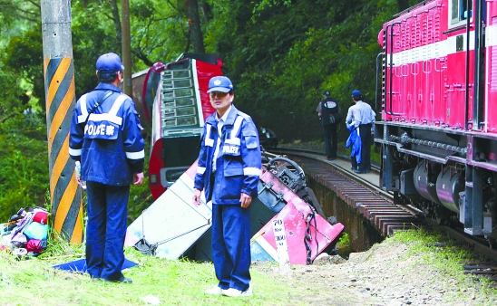 4月27日,警察在台湾阿里山火车事故现场警戒。 新华社记者 龚兵 摄