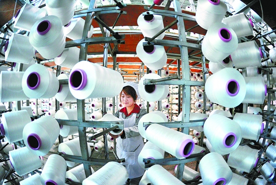 义乌一纺织企业工人在纱架上工作。当地一些企业采取给老员工发“工龄工资”、续签用工合同有奖、新招工人免费培训等措施来稳定员工队伍。张建成 摄