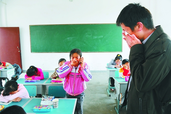在徐世卿妻子陈芬芳曾经支教的营盘乡中心小学,同学们和远在浙江的陈芬芳通电话时,徐世卿(右一)和同学们都流下了激动的泪水。四川日报记者 何海洋 摄