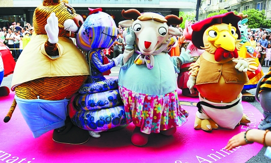 昨日,盛大的动漫彩车巡游表演在杭州市中山北路举行。美人鱼、蜘蛛侠等迪士尼家族卡通巨星,国产美猴王等经典卡通形象精彩亮相。 本报记者 梁臻 通讯员 魏志阳 摄