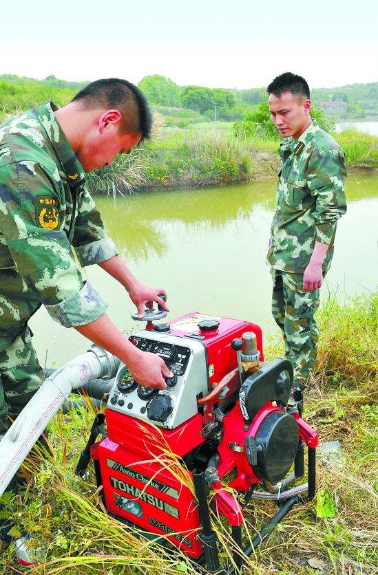 5月1日,嵊州市消防大队在得知该市开口乐果蔬专业合作社多口山塘干旱多日的消息后,紧急派出党员突击队员前往抗旱。 张亮宗 摄