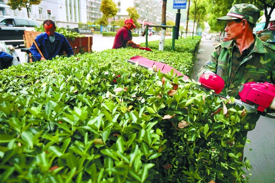 5月1日,舟山园林工人放弃休息,加班加点修剪景观带的花草、树木。