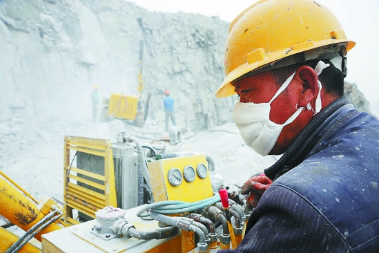 5月1日上午,舟山市金塘岛北部开发重点建设工地上,这位姓陈的师傅在操纵机器打炮眼。姚峰 摄