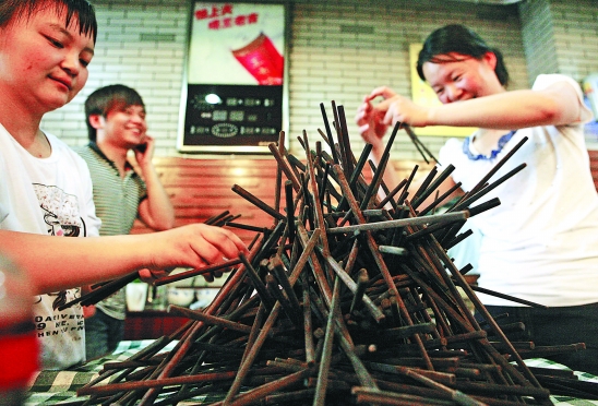 “五一”节,杭州某面馆服务员正在收拾晾干的木筷。假日里,餐饮企业要比平时忙碌很多。 屠春 摄