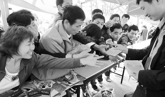 4月28日,温州市鹿城区藤桥镇,农民们争相抢要农技科普知识的音像资料与画册。当日,“温州专家咨询服务团送科技下乡鹿城行”活动,受到了广大农户们的欢迎。