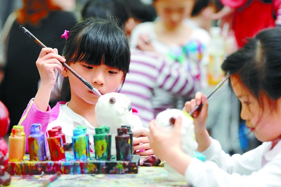 “五一”小长假期间,杭州许多小朋友在家长的陪伴下来到市青少年活动中心,自己动手绘画,学习制作雕塑,给雕塑上色等,让五彩缤纷的“第二课堂”丰富自己的假期生活。图为小朋友在为白色的雕塑上色。 新华社记者 鞠焕宗 摄