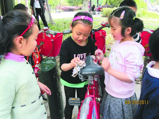 “五一”期间,杭州大成实验幼儿园大班的小朋友拿起抹布,提着水桶来到公共自行车点,给每一辆自行车都好好地洗了个澡。通讯员 陈敏 摄