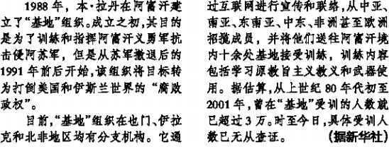 1988年,本·拉丹在阿富汗建立了“基地”组织。成立之初,其目的是为了训练和指挥阿富汗义勇军抗击侵阿苏军,但是从苏军撤退后的1991年前后开始,该组织将目标转为打倒美国和伊斯兰世界的“腐败政权”。