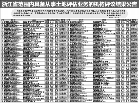 根据国土资源部关于土地评估中介机构监督管理的有关规定,浙江省国土资源厅对我省已在中国土地估价师协会和浙江省土地估价师协会注册登记,具备在全省一定范围内执业的土地评估中介机构的资质条件、土地估价报告和土地估价业绩进行了评议,现将评议合格的土地评估中介机构予以公告。