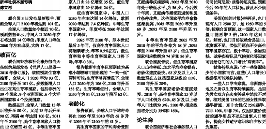 2095年至2100年,即本世纪最后5年间,仅高生育率国家人口将继续增长,年率0.5%左右。低生育率和中等生育率国家人口将下降,年率0.3%。