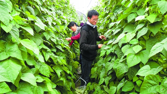 温建辉与帮工一道采摘四季豆。徐宪忠 摄