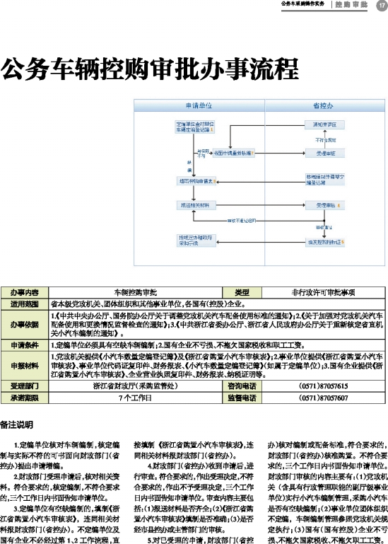 办事依据 1.《中共中央办公厅、国务院办公厅关于调整党政机关汽车配备使用标准的通知》;2.《关于加强对党政机关汽车配备使用和更换情况监督检查的通知》;3.《中共浙江省委办公厅、浙江省人民政府办公厅关于重新核定省直机关小汽车编制的通知》 。
