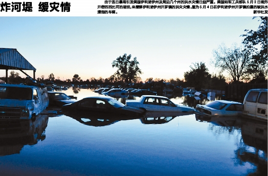 由于连日暴雨引发美国伊利诺伊州及周边几个州的洪水灾情日益严重。美国陆军工兵部队5月2日晚炸开密西西比河的堤坝,来缓解伊利诺伊州开罗镇的洪灾灾情。图为5月4日在伊利诺伊州开罗镇拍摄的被洪水浸泡的车辆。 新华社发