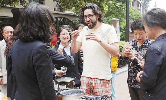 图:立夏,民间有“立夏日食乌米饭,蚊虫不叮不疰夏”的说法。当天,杭州西溪街道花园亭社区蒸制了4大锅乌米饭,免费馈赠社区内的中外居民。