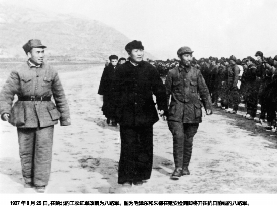 1937年8月25日,在陕北的工农红军改编为八路军。图为毛泽东和朱德在延安检阅即将开往抗日前线的八路军。