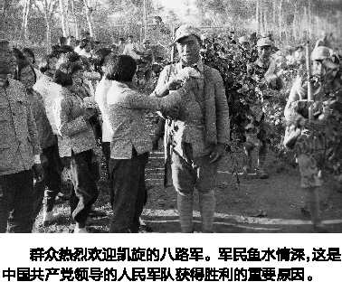 群众热烈欢迎凯旋的八路军。军民鱼水情深,这是中国共产党领导的人民军队获得胜利的重要原因。