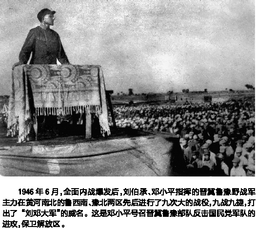 1946年6月,全面内战爆发后,刘伯承、邓小平指挥的晋冀鲁豫野战军主力在黄河南北的鲁西南、豫北两区先后进行了九次大的战役,九战九捷,打出了 “刘邓大军”的威名。这是邓小平号召晋冀鲁豫部队反击国民党军队的进攻,保卫解放区。