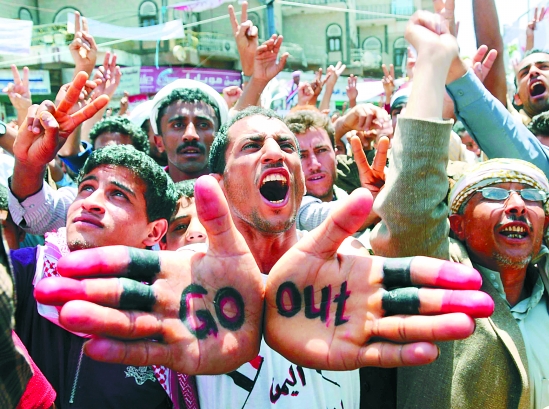 | 也门民众“轰”政府 5月6日,10余万反政府示威者在萨那大学附近举行游行集会,一名反政府示威者手上写着“离开”。当日,也门总统萨利赫在萨那对来自全国各地的数十万政府支持者发表讲话表示,将坚定地与反对派抗争到底。 新华社记者 尹炣 摄 |