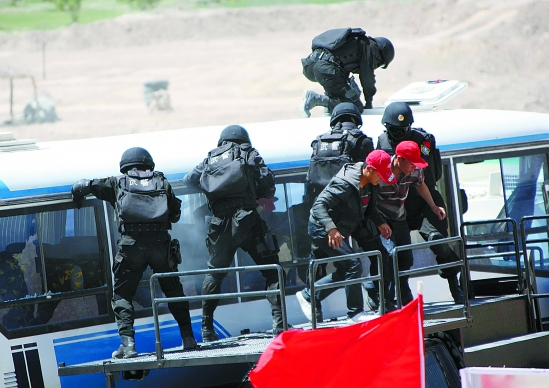 在演习中,特警队员冲入“恐怖分子”劫持的客车展开攻击。新华社记者 袁满 摄