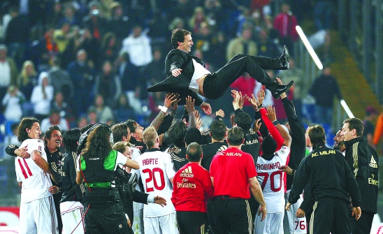 图为AC米兰队球员将主教练阿莱格里抛向空中,庆祝夺冠。新华社发