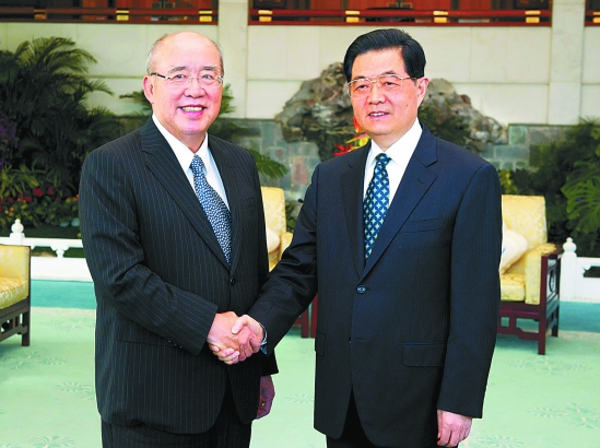 5月10日,中共中央总书记胡锦涛在北京钓鱼台国宾馆会见中国国民党荣誉主席吴伯雄。 新华社记者 黄敬文 摄