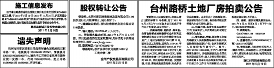 受路桥区人民法院委托,经椒工商[11]前拍字第21号备案,定于2011年6月2日上午10时在本公司拍卖厅举行公开拍卖会,现公告如下:
