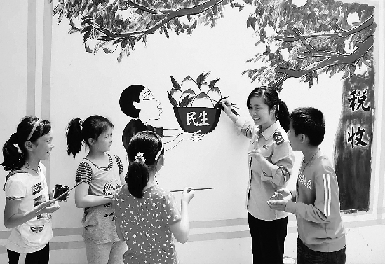 | 4月29日,浦江县实验小学的近50名学生,在主城区的百米墙壁上举行税收宣传墙画创作活动。孩子们以独特而富有想象力的视角,用充满童真稚趣的画笔淋漓尽致地勾勒出了“税收带来家乡美 ”的动人画面。图为税务干部在现场辅导学生开展漫画创作。 黄自强 摄 |