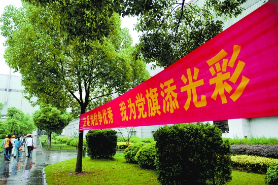 在杭钢集团,到处都有“我为党旗添光彩”的横幅。