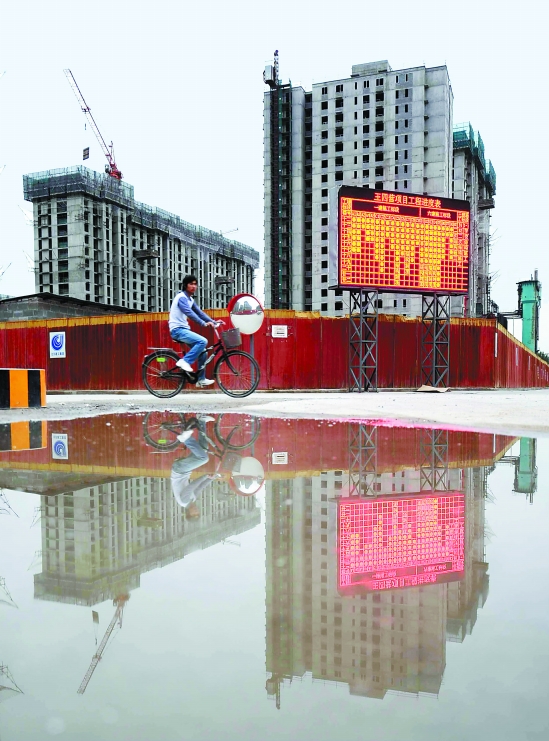 一名下班的工人骑车走出北京市朝阳区王四营保障性住房建设项目工地(5月9日摄)。 新华社记者 罗晓光 摄