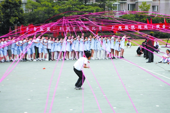 5月12日,在杭州青蓝小学第九届田径运动会上,学校“跳绳社团”逐一上阵,各种创新跳绳花样迭出。六年级同学展示了网绳表演:80名同学齐摇40根长绳,上下翻飞,一气呵成。 通讯员 屠春 记者 汪起腾 摄