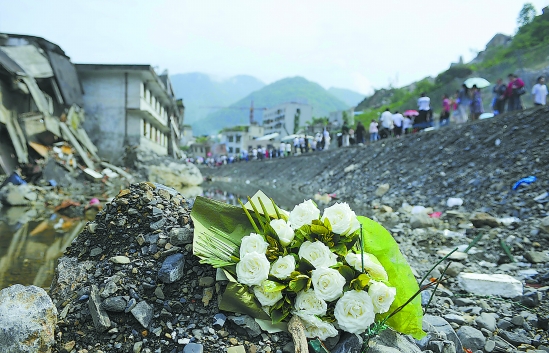 图为5月12日拍摄的老北川县城废墟上摆放的鲜花。 新华社发
