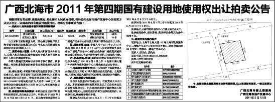 广西北海市2011年第四期国有建设用地使用权出让拍卖公告