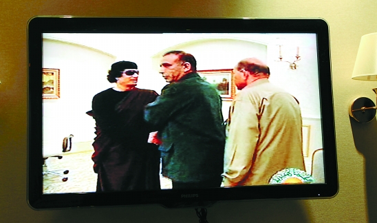 这是利比亚国家电视台5月11日播出的利领导人卡扎菲会见东部地区部落首领的视频截图。 新华社发
