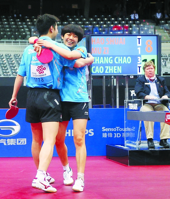5月13日,中国选手张超/曹臻(左二)庆祝胜利。当日,在2011年世界乒乓球(单项)锦标赛混合双打决赛中,中国选手张超/曹臻以4比1战胜队友郝帅/木子,获得冠军。 新华社发