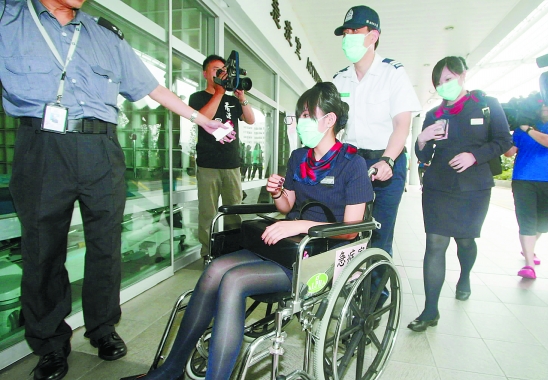 5月13日,港龙航空一架由北京飞香港的客机,在空中遇到气流,共7人受伤。图为受伤的机舱服务员被送到医院治疗。 新华社发