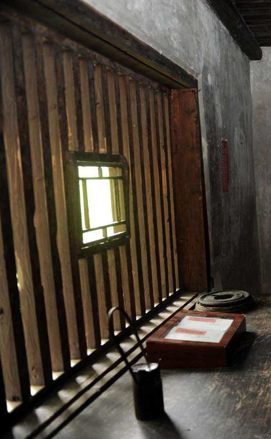 这是井冈山茅坪八角楼内临窗摆放的砚台、油灯和毛泽东的《中国的红色政权为什么能够存在?》等著作(4月10日摄)。 新华社记者 周科 摄