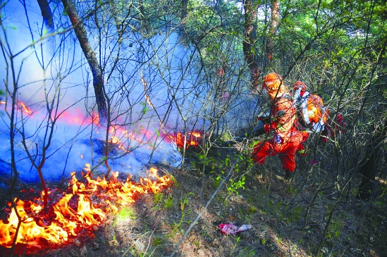 5月14日,大连森林消防队员在大连近郊山火现场灭火。当日发生在大连市甘井子区红旗镇棠梨南沟附近的山火目前已基本扑灭,未发生人员伤亡事故。据有关方面初步统计,火场过火面积300余亩。起火原因正在调查中。 新华社发