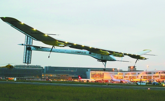 | 太阳能飞机跨国首飞 5月13日,“太阳驱动”号太阳能飞机,用12小时59分飞行630公里,从瑞士帕耶那机场起飞,途经法国和卢森堡,抵达布鲁塞尔,成功完成首次跨国飞行。图为在比利时布鲁塞尔国际机场拍摄的世界最大的太阳能飞机——瑞士制造的“太阳驱动”号。 新华社发 |