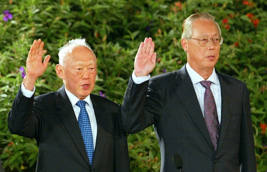 这是2004年8月12日拍摄的李光耀(左)和吴作栋的资料照片。 新华社发