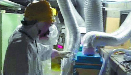 5月6日,工作人员在福岛第一核电站一号机组涡轮机房内观测通风设备。