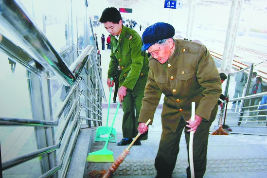 90多岁的刘应启在扬州火车站做志愿者打扫卫生。新华社发(资料照片)