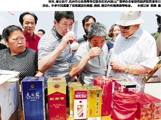昨天,省公安厅、杭州市公安局等单位联合在杭州吴山广场举办全省防范经济犯罪宣传日活动。许多市民观看了现场摆放的假酒、假烟、假证件和假牌照等物品。本报记者 梁臻 摄