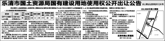 (1)公开拍卖出让时间:2011年5月31日10时,在乐清市招投标中心招拍挂大厅举办。