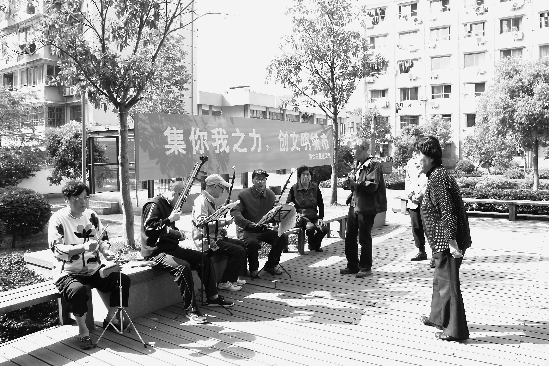 快板在小区内传唱。灵隐街道浙大求是社区的公园里,最近上演了一出出由社区志愿者自编自演的快板书,这是社区为加大居民群众对创建的关注力度,而组织的活动之一。裘施 摄